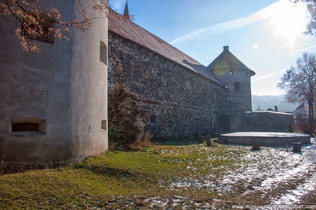 1. Primul pe lista, Castelul Sukosd – Bethlen din Racos. Se afla in centrul satului, este semnalizat si pare-se ca, curtea exterioara deserveste a parculet. Cred ca daca ar fi avut la baza zidurile un set de proiectoare ar fi foarte placut sa stai pe bancute seara. Din pacate, asa cum ne asteptam, poarta era inchisa insa se putea suna portarul si probabil ar fi venit sa ne lase inauntru. Cu toate ca afara era un soare puternic, gerul era si mai puternic, asa ca am tras cateva poze si-am zbughit-o catre urmatorul objectiv.